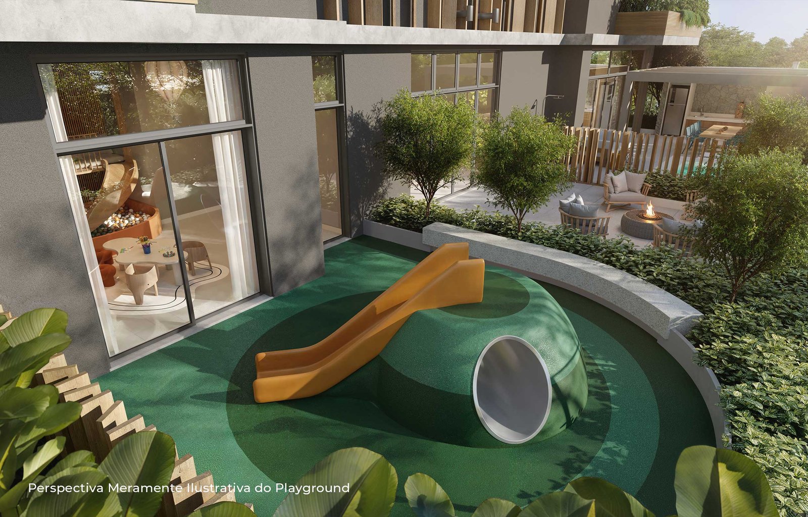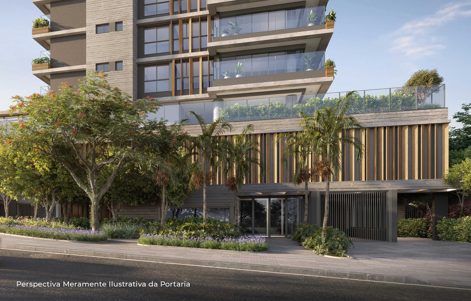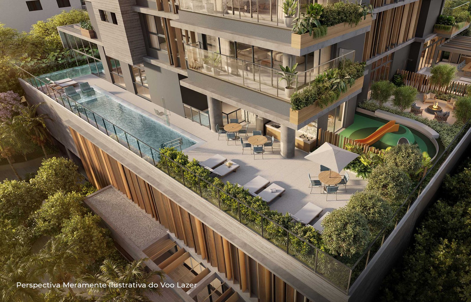 “Com desenho paisagístico exclusivo e sofisticado, o projeto integra os ambientes internos com os externos, promovendo fluidez e conexão entre os espaços. A utilização de materiais naturais e a presença predominante de espécies nativas criam ambientes biofílicos, ideais para o lazer, o brincar, o esporte e o convívio. As experiências sensoriais ganham protagonismo, estimulando a relação afetiva dos moradores com a natureza. O bosque na entrada do empreendimento, composto por espécies nativas como pau-brasil, copaíbas, ipês, jabuticabeiras e grumixamas, dá boas-vindas com sombra, aromas e cores, configurando uma praça de acesso, que funciona como gentileza urbana. Esse espaço arborizado estabelece um diálogo natural entre o empreendimento e a cidade, criando um percurso acolhedor e convidativo desde o primeiro contato, ao mesmo tempo em que reforça o compromisso com a valorização ambiental.”