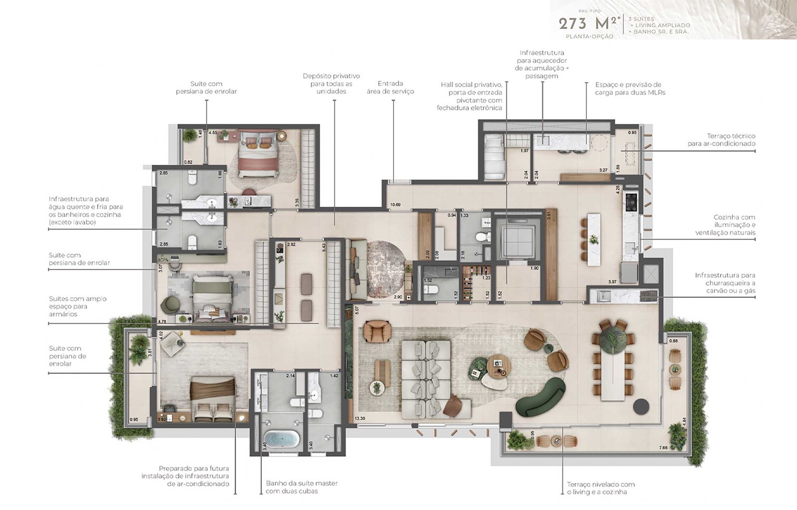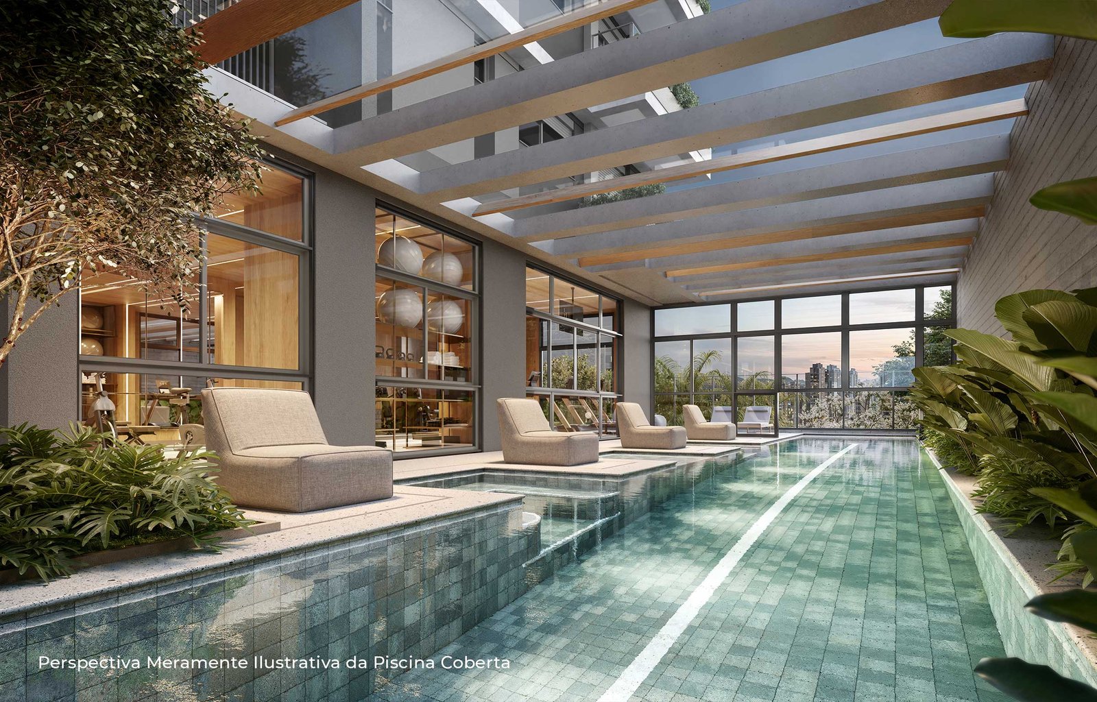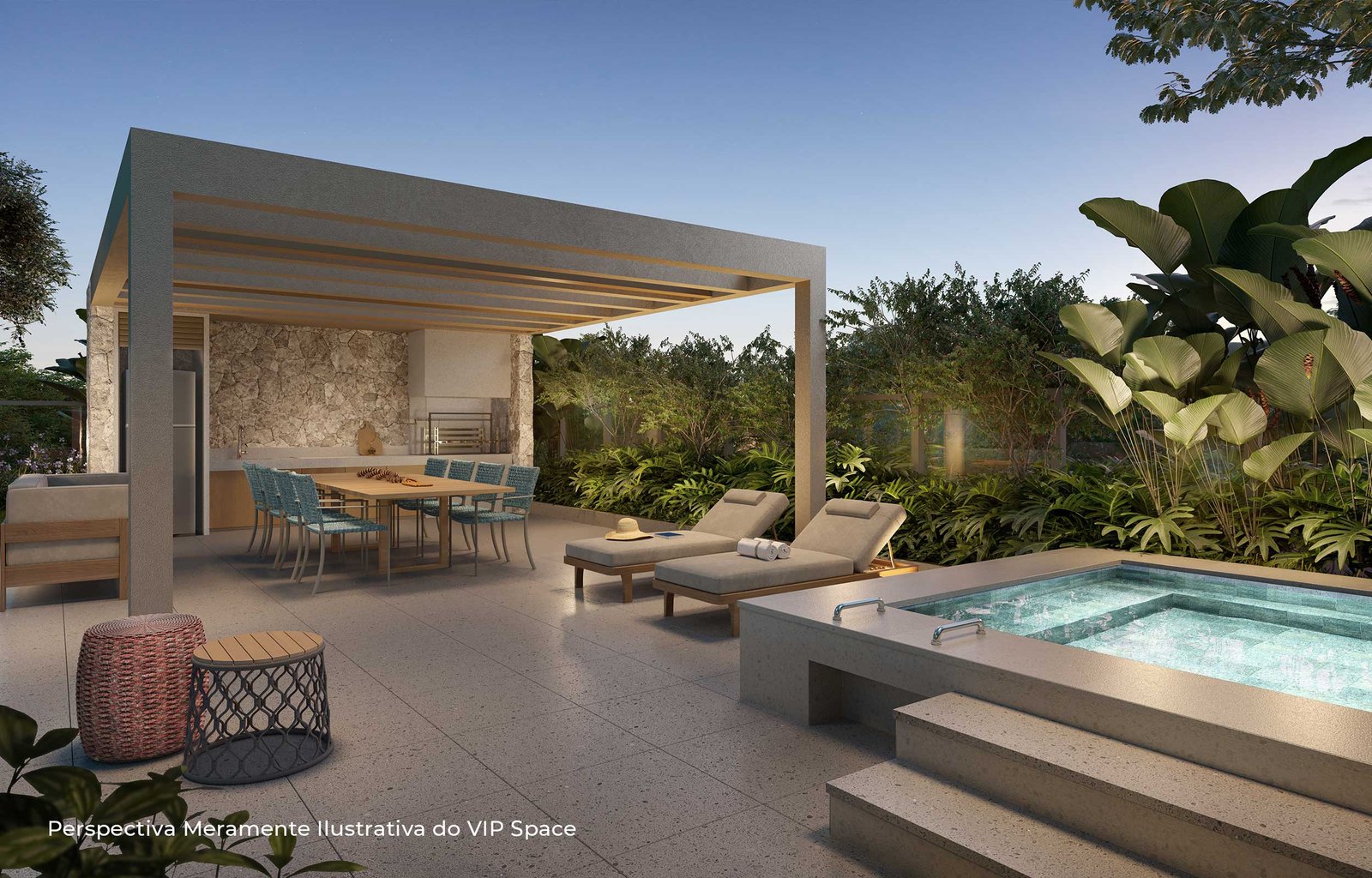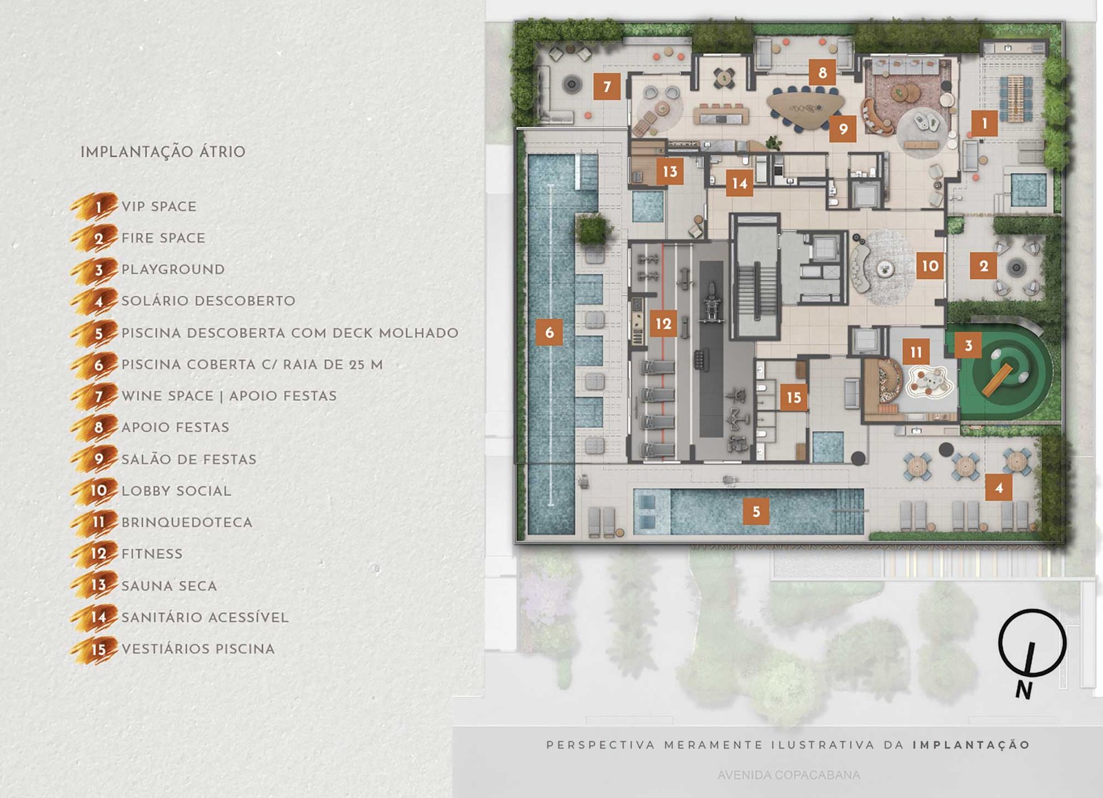 “Com desenho paisagístico exclusivo e sofisticado, o projeto integra os ambientes internos com os externos, promovendo fluidez e conexão entre os espaços. A utilização de materiais naturais e a presença predominante de espécies nativas criam ambientes biofílicos, ideais para o lazer, o brincar, o esporte e o convívio. As experiências sensoriais ganham protagonismo, estimulando a relação afetiva dos moradores com a natureza. O bosque na entrada do empreendimento, composto por espécies nativas como pau-brasil, copaíbas, ipês, jabuticabeiras e grumixamas, dá boas-vindas com sombra, aromas e cores, configurando uma praça de acesso, que funciona como gentileza urbana. Esse espaço arborizado estabelece um diálogo natural entre o empreendimento e a cidade, criando um percurso acolhedor e convidativo desde o primeiro contato, ao mesmo tempo em que reforça o compromisso com a valorização ambiental.”